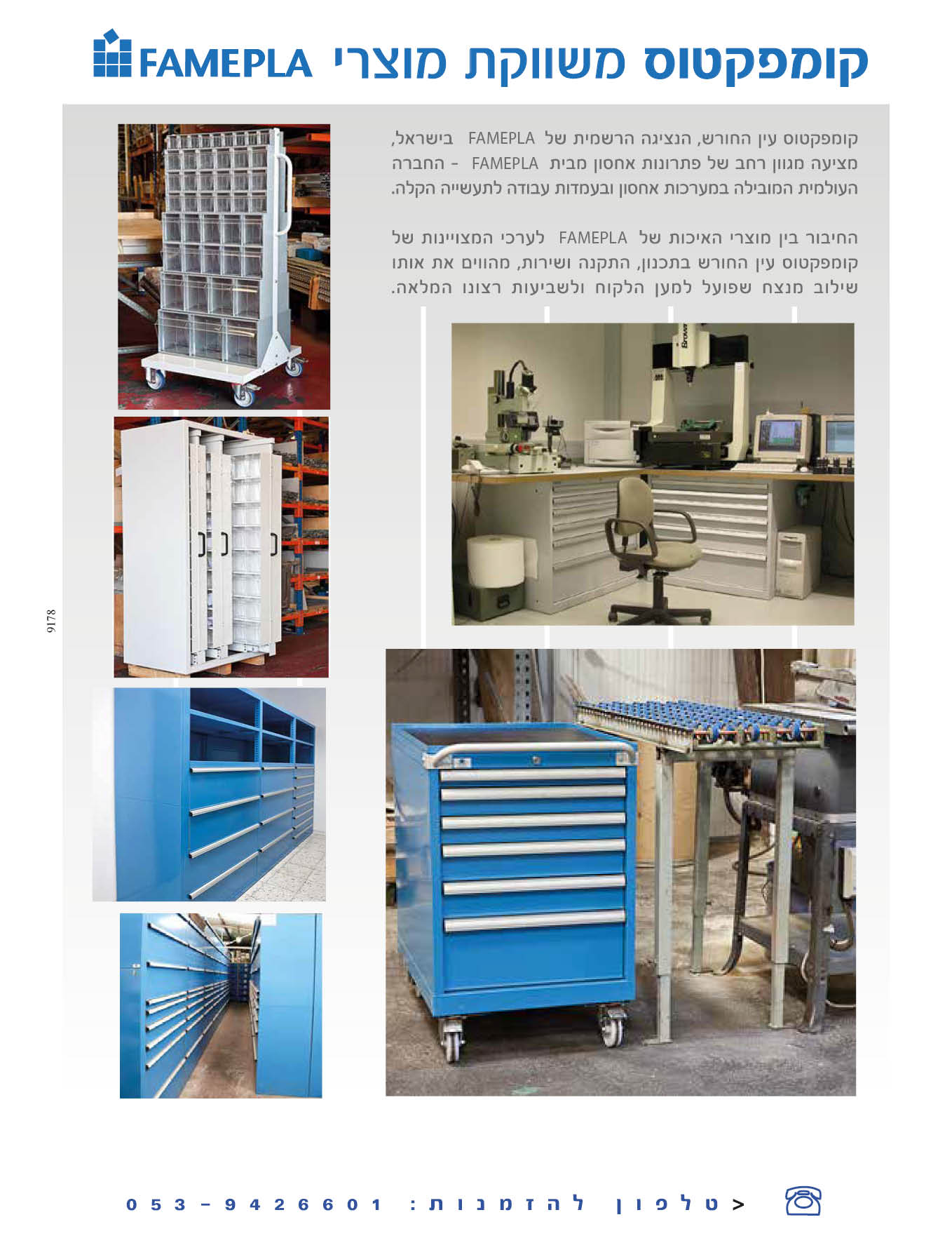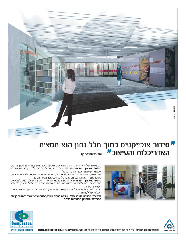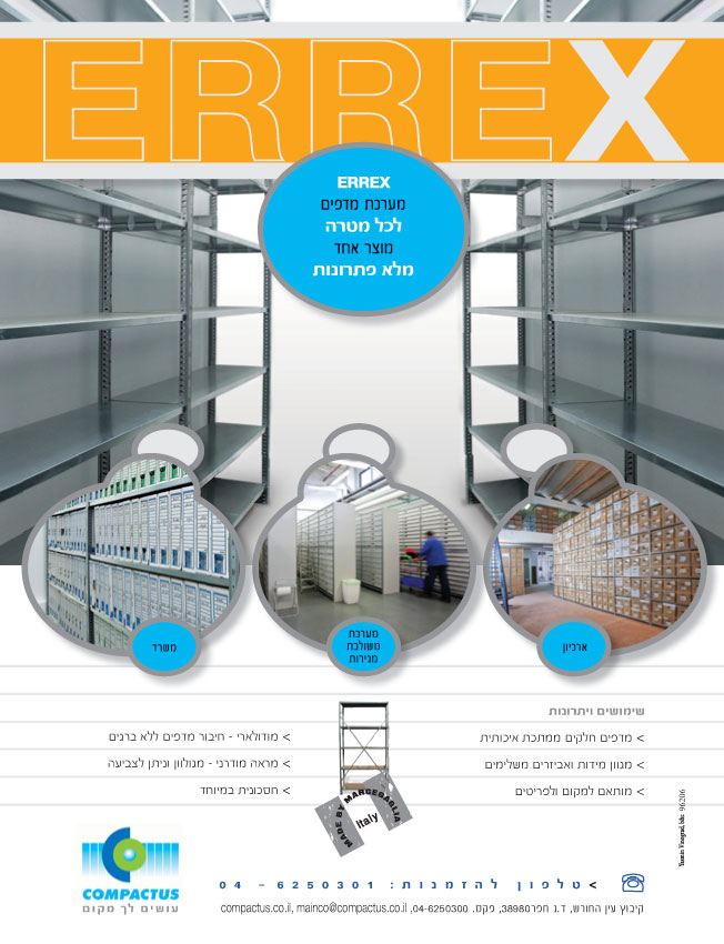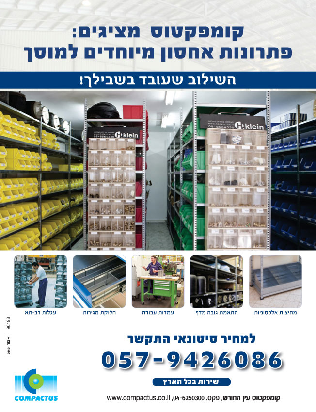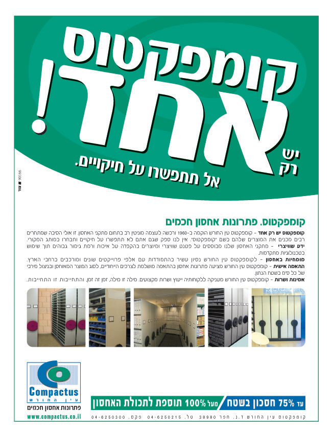 קומפקטוס בע"מ – פתאום יש מקום לכל דבר. כשהעסק שלך הצליח וגדל, הוספת עוד כסא ועוד שולחן, ואחר-כך עוד מדף ועוד מגירות. אבל אם עכשיו כבר אין לך יותר מקום לזוז, דרוש זמן לאחסן ולמצוא מסמכים חשובים, וגם לא כל כך נעים לעבוד ולארח לקוחות בסביבה כזו.הגיע הזמן לעשות סדר, לפנות מקום ולהגדיל משמעותית את שטח האחסון שלך. את זה אנחנו יודעים לעשות הכי טוב.כשמדובר בניצול מקסימאלי של שטח האחסון - פתרונות המידוף והאחסון הייחודיים שלנו נותנים לך מענה אופטימאלי.